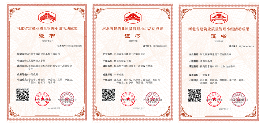 5月15日,七分公司申报的“提高防水卷材SBS一次封边合格率”“提高剪力墙层间施工一次验收合格率”“提高混凝土装配式免拆板安装一次验收合格率”三项QC成果,被河北省建筑业协会评为“一等成果”。这不仅是河北省建筑业协会对分公司技术创新能力的高度认可,更是分公司扎实开展QC小组活动、有效攻克施工难题、提升项目施工质量的生动写照。