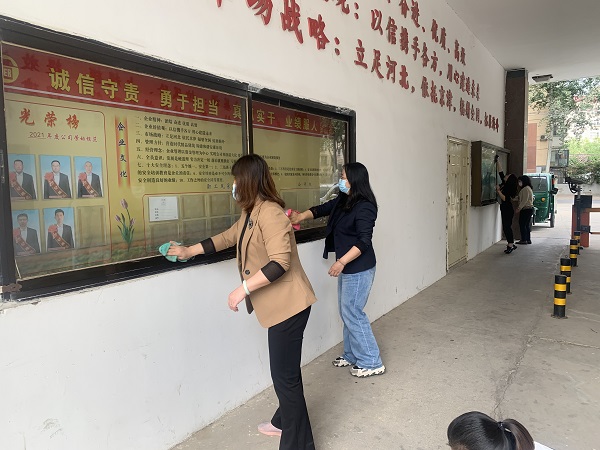 院内整理清扫完毕后,大家又转移阵地到办公楼内,对办公室、厕所、楼道等区域进行了打扫。党员们充分发扬“甩开膀子、挑起担子”的精神,擦拭玻璃、打扫地面、清理垃圾,全方位消毒喷杀,每一步都认真到位,不留死角。经过近三个小时的辛勤劳动,院里绿化带的枯枝、杂草得到了整治,机关大院内更加整洁美观,环境焕然一新。机关办公室窗明几净、一尘不染,所有卫生死角被彻底清理。大家擦擦汗水,露出会心的微笑。