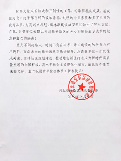 2021年2月下旬,公司收到雄安新区建设指挥部感谢信,信中就公司对雄安新区建设的支持帮助表示感谢,对选派到雄安新区工作的王现峰、孙文超同志给予高度肯定。