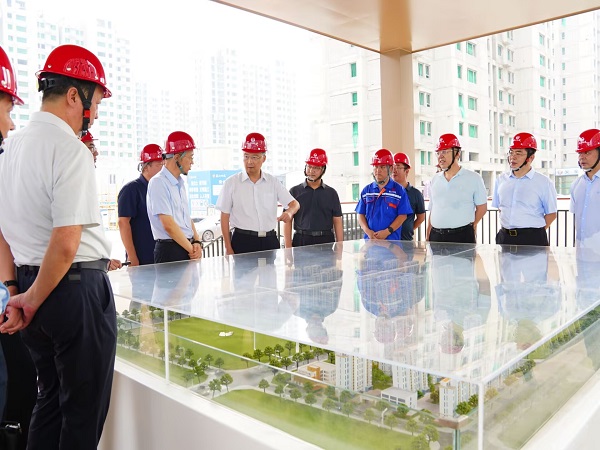 在项目施工现场的实体沙盘前,王现坤认真听取了项目整体规划、建设进展的汇报,仔细询问了项目规划方案落实、安全生产管理及工程质量保障等关键环节的具体情况。通过实地察看和听取详细介绍,王现坤对项目整体管理水平给予了肯定。